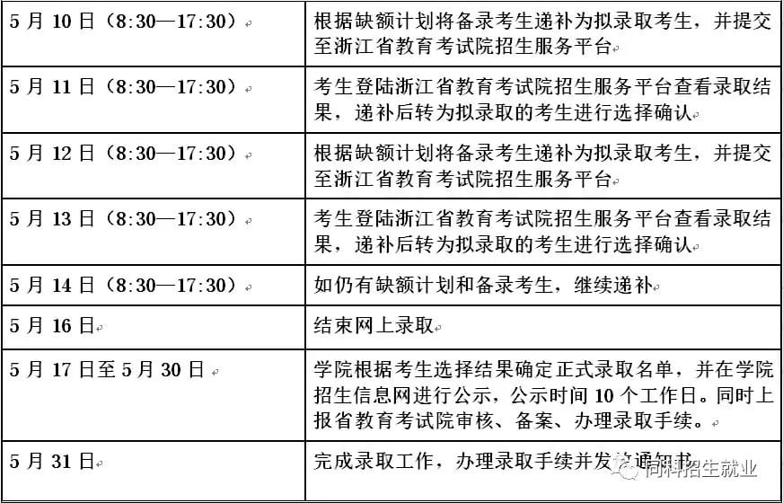 第十八条 拟录取考生登陆浙江省考试院高职提前招生服务平台,选择一所院校作为录取结果,未在规定时间内登陆服务平台选定录取学校的考生视为自动放弃该批次所有拟录取资格。备录取考生根据录取进程、待转为拟录取状态后方可登陆平台进行录取选择。学院根据考生选择结果确定正式录取名单,并在学院招生信息网进行公示,公示时间10个工作日,同时上报省教育考试院审核、备案、办理录取手续。
