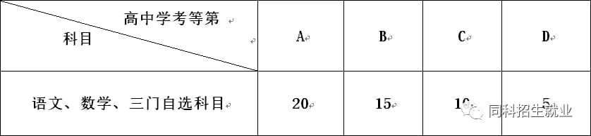 普高招生考生高中学业水平考试(学考)折算成绩由2门必选科目+3门自选科目组成,五门科目成绩进行折算,不同等第换算成相应分值,满分为100分。必选科目为语文、数学,三门自选科目从外语、物理、技术、政治、历史、地理、化学、生物中选择学考等第最优的三门。高中学考等第以浙江省教育考试院提供的成绩为准,换算如下表: