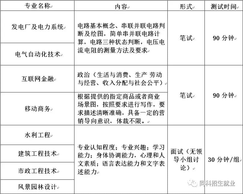 测试内容为语文、数学和素质特长分。其中素质特长分为20分,语文和数学的考试方式为笔试,考试时间90分钟,语文满分分值50分,数学满分分值30分,按浙江省教育考试院2019年单独考试招生文化考试语文、数学考试大纲标准命题。素质特长分满分分值20分,同时符合多项计分条件的,只能取其中最高一项分值作为考生素质特长分。考生素质特长分经学院提前招生工作领导小组审核后确认。素质特长分申请的考生,确定入围后在学院招生网下载“素质特长计分申请表”。